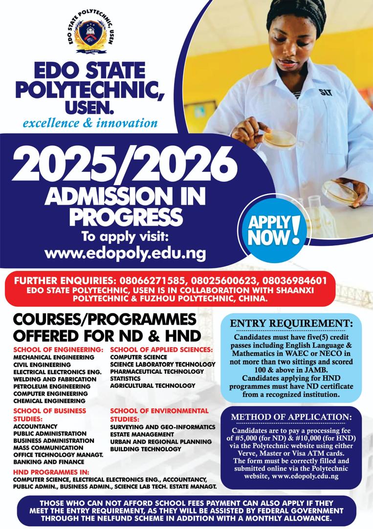 It is with great pleasure that I welcome you to the Edo State Polytechnic. The Institute currently has four (4) schools and runs National Diploma and Higher Diploma in different programmes in Technology and Management. I invite you to explore our wide selection of programmes specially designed for you – whether you are a student or a professional seeking to improve your skills or gain state-of-the-art knowledge in your field. We’re a leading technological Polytechnic with students from different parts of the world. Our up-to-date curriculum completely furnishes the students with the ability to tackle and manage several technology-based problems both at the national and international levels.